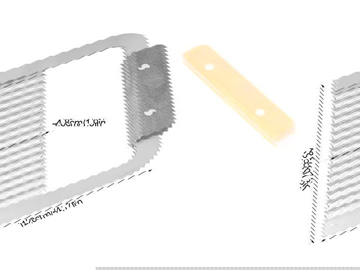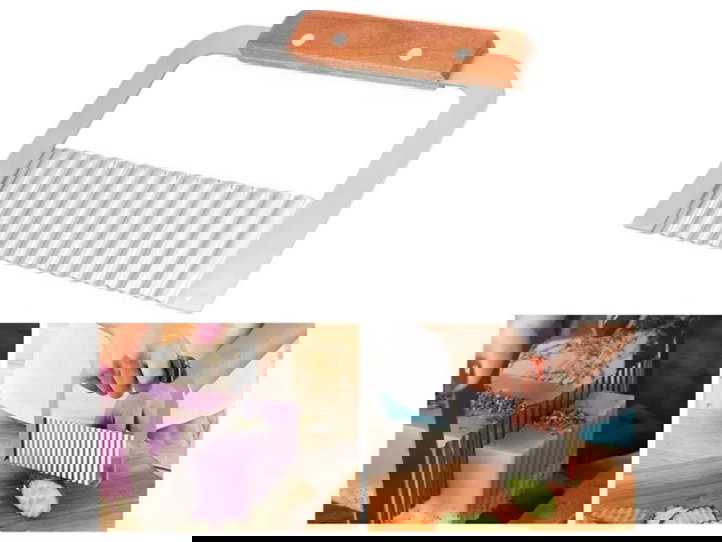 Este producto es un cortador de patatas ondulado de acero inoxidable con mango de madera. Material: Hoja de acero inoxidable duradera con mango de madera ergonómico para un agarre cómodo. Diseño: Cuenta con una hoja ondulada ideal para cortar patatas, verduras, frutas, o incluso jabones artesanales con formas decorativas. Dimensiones: Aproximadamente