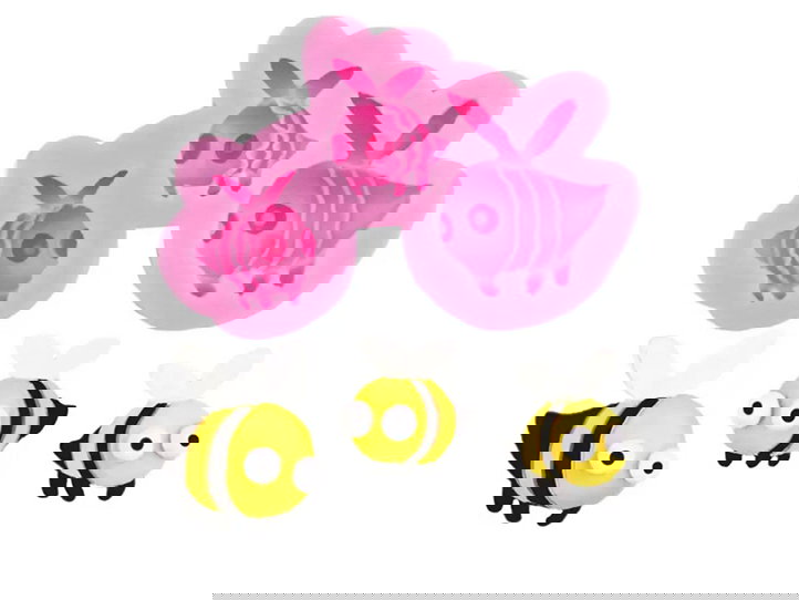 Este producto es un molde de silicona con formas de abejas de dibujos animados, ideal para repostería o manualidades.