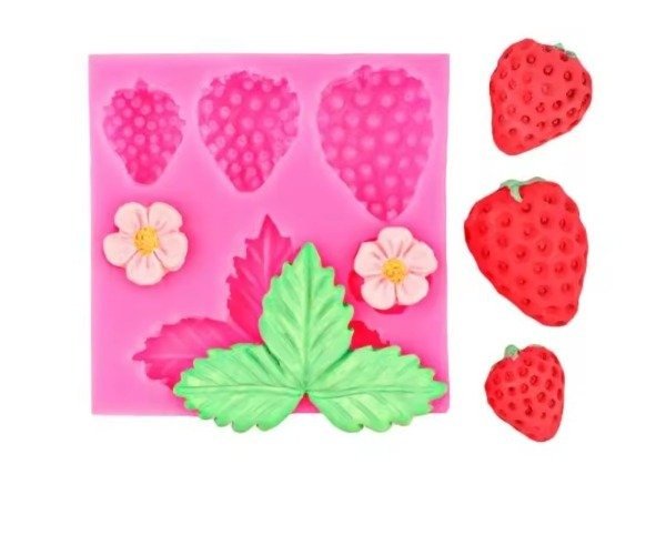 El producto en la imagen es un molde de silicona para repostería con diseños de fresas y flores,