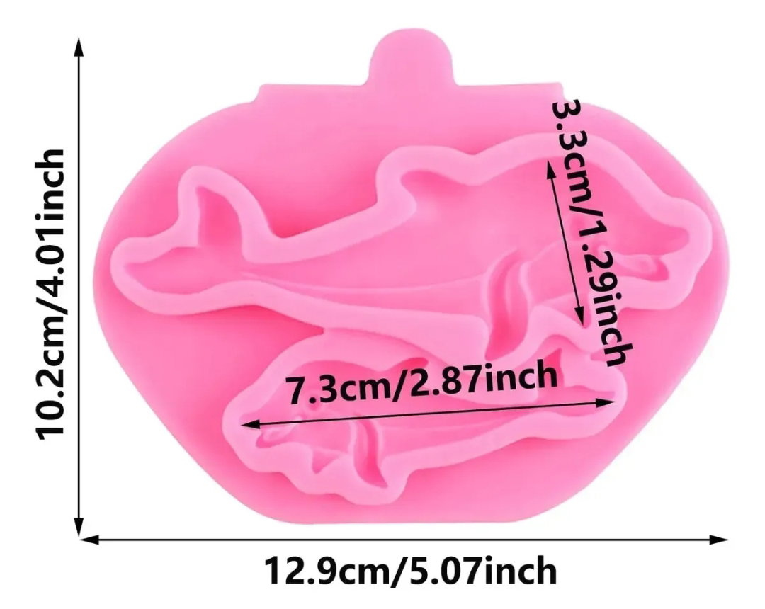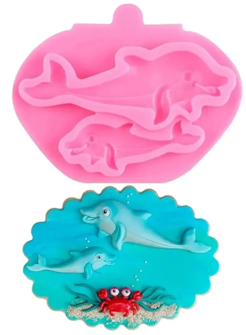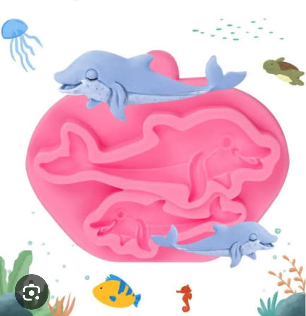 El molde tiene forma de delfín y otros elementos marinos, ideal para temáticas del mar.